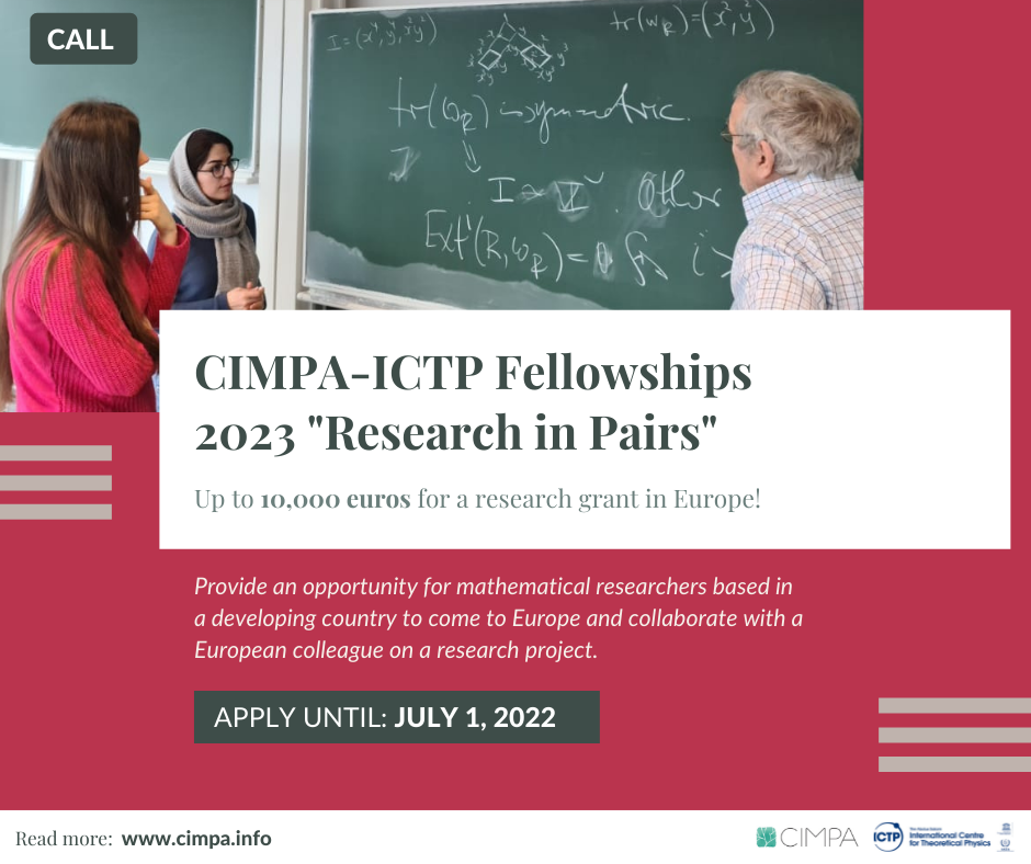 The CIMPA-ICTP fellowships program "Research in Pairs" makes it possible for researchers in mathematics based in a developing country to come to Europe to collaborate with a colleague for a period of at least 6 weeks.
