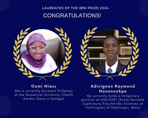 Anne Philippe, President of SFdS (Société Française de Statistique), Samir Adly, President of SMAI (Société de Mathématiques Appliquées et Industrielles), Isabelle Gallagher, President of SMF (Société Mathématiques de France), are pleased to announce that the Ibni Oumar Mahamat Saleh Prizes 2024 have been awarded to Adivignon Raymond Hounnonkpe & Oumi Niass.