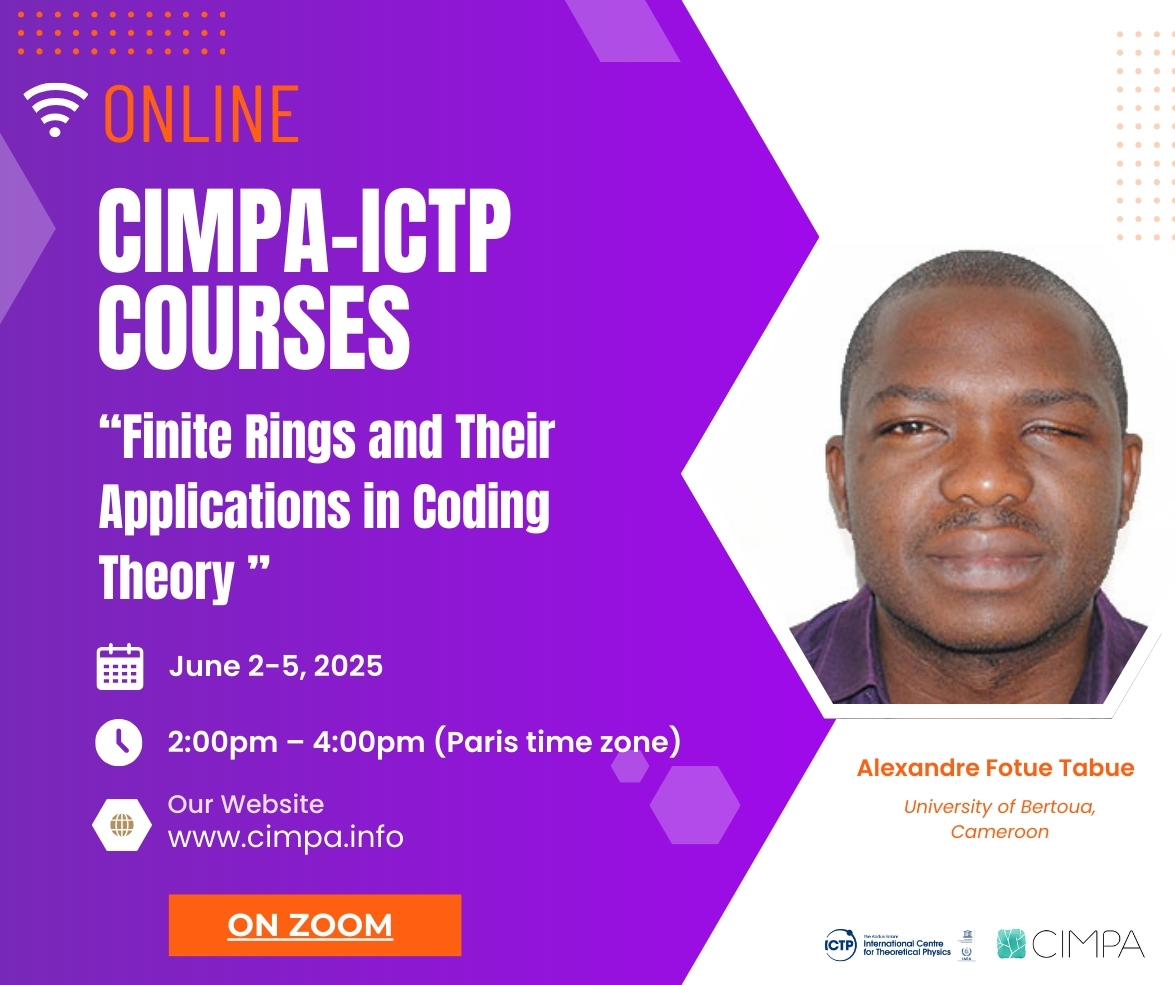 Rejoignez le cours en ligne d'Alexandre Fotue Tabue "Finite Rings and Their Applications in Coding Theory" du 2 au 5 juin 2025.