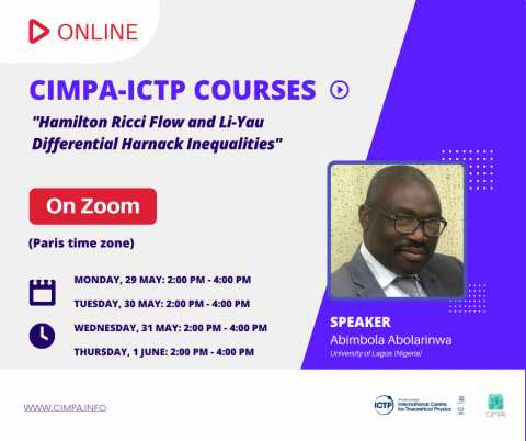 Rejoignez le cours de Abimbola Abolarinwa "Hamilton Ricci Flow and Li-Yau Differential Harnack Inequalities" du 29 mai au 1 juin.